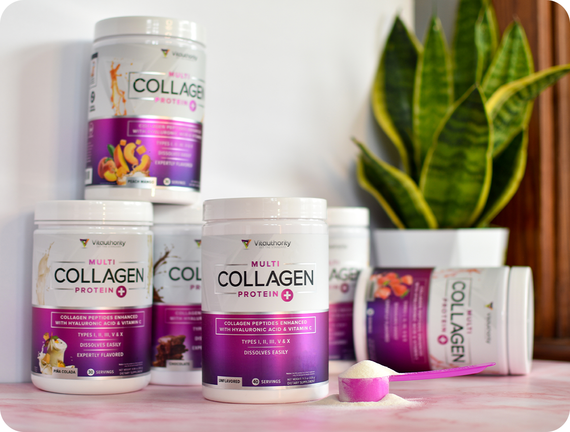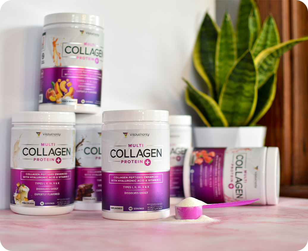 Vitauthority’s Multi Collagen Protein+ Peptides is a premium collagen protein supplement formulated to support skin hydration, joint mobility, and muscle recovery. Featuring a blend of Type I, II, III, V & X collagen peptides, this formula promotes hair and nail strength, gut health, and overall wellness. Enhanced with hyaluronic acid for deep skin hydration and vitamin C to boost collagen synthesis, it helps maintain youthful skin, strong joints, and healthy connective tissues. With added protein for muscle repair and recovery, this easy-to-mix powder is perfect for active lifestyles and daily wellness. Free from artificial additives, gluten, and dairy, it’s the ultimate collagen boost for whole-body health.