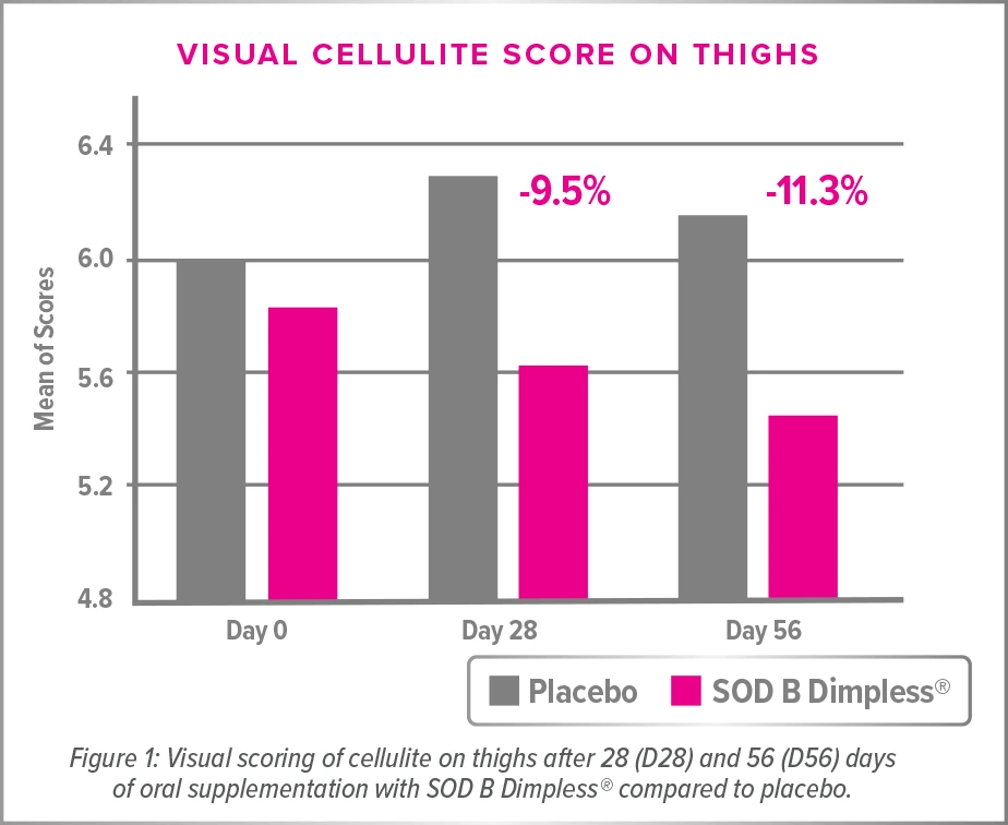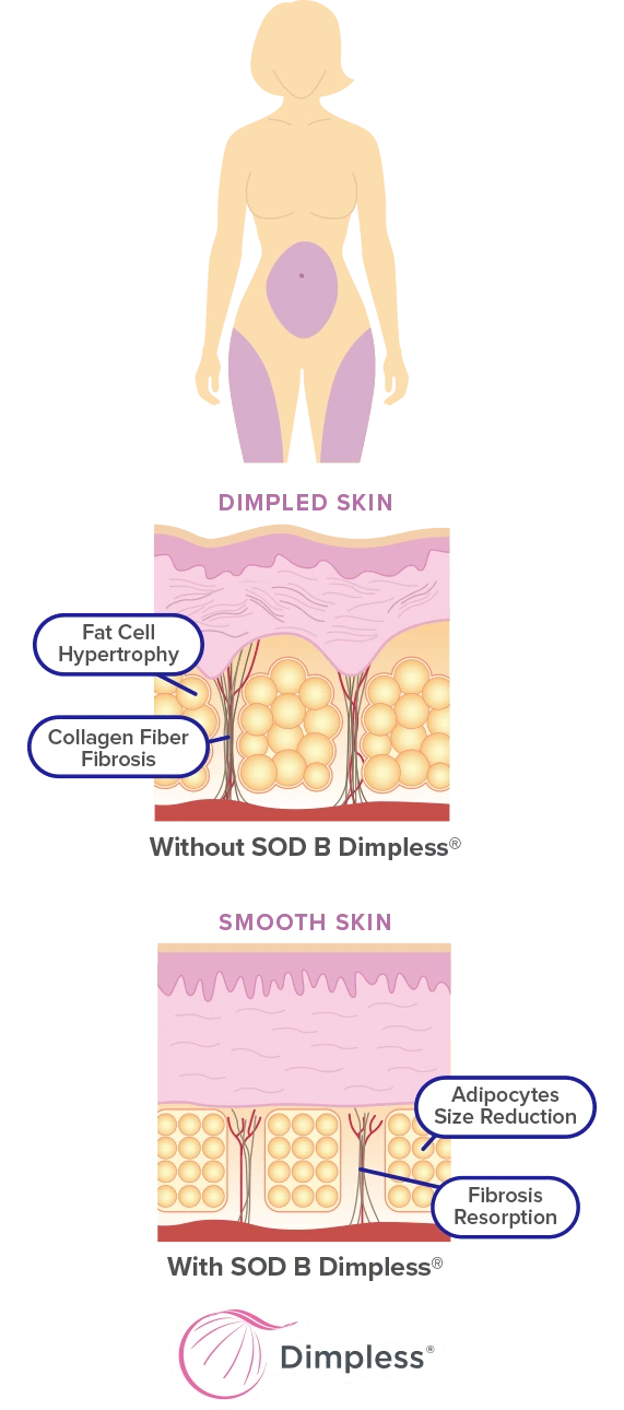 SOD B DimplessĀ® is the only active ingredient that specifically targets cellulite and the only one with clinical evidence to reduce cellulite by oral route and is exclusive to Vitauthority.*