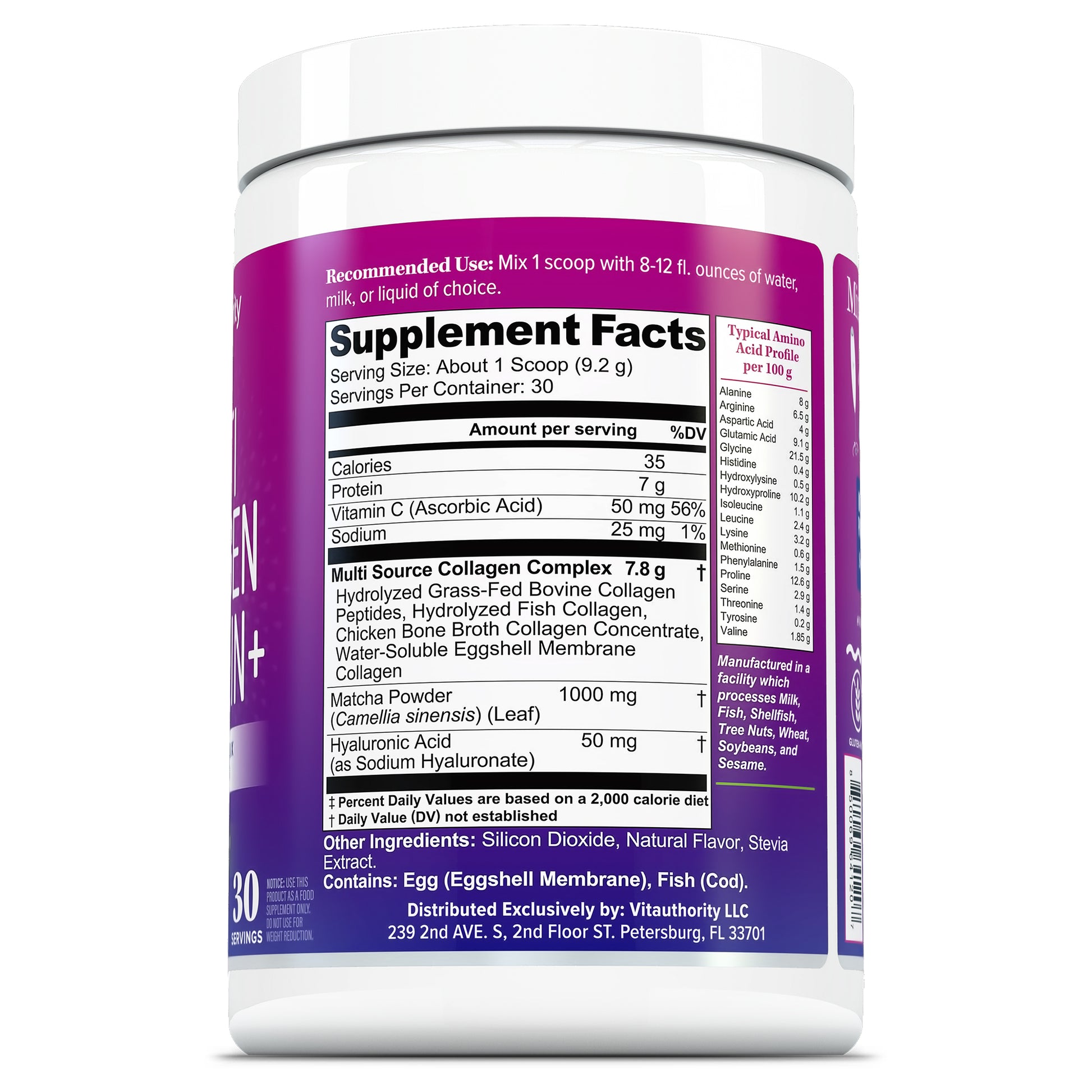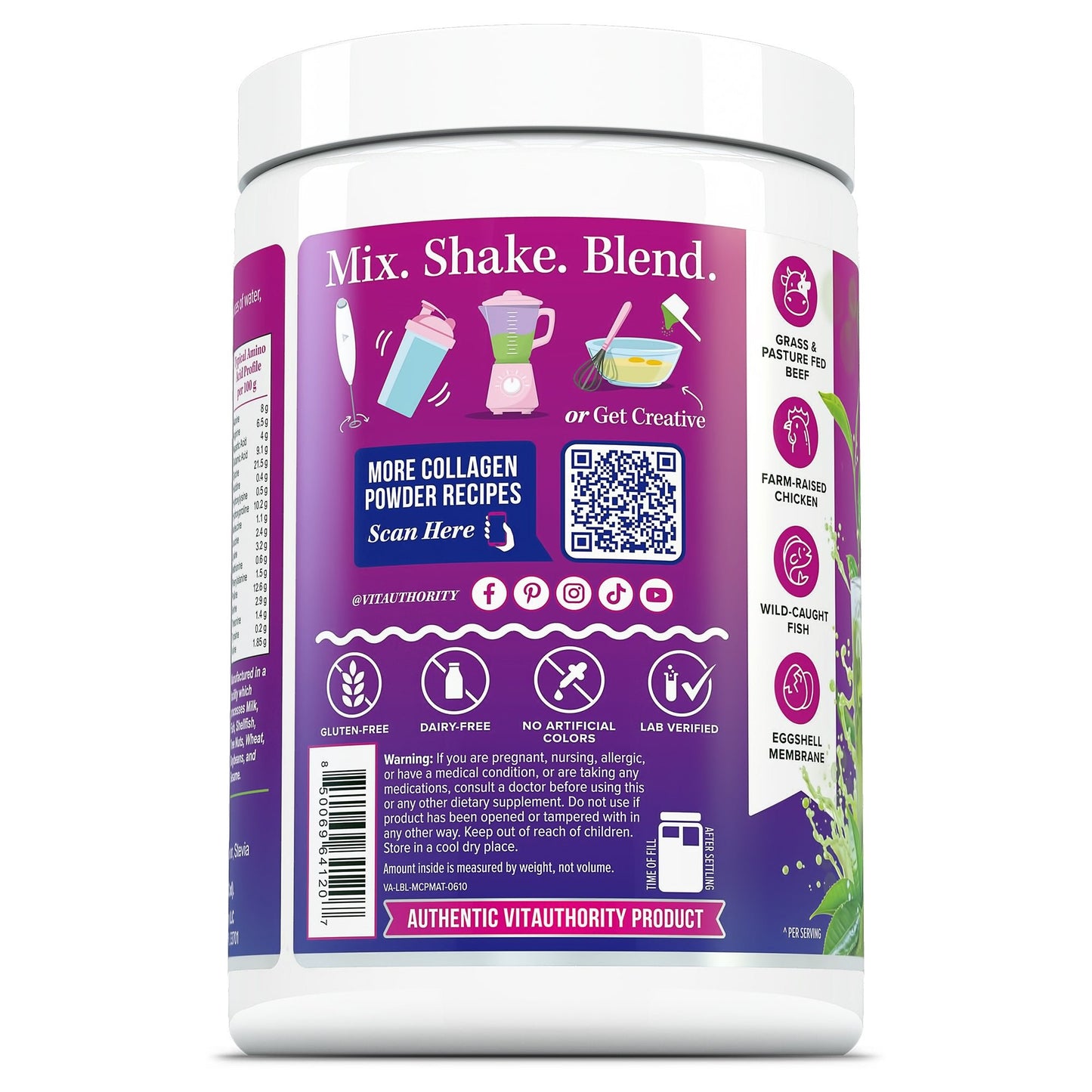 Vitauthority’s Multi Collagen Protein+ in Matcha Flavor delivers a powerful blend of five collagen types (I, II, III, V & X), 1,000 mg of real matcha powder, and 50 mg of hyaluronic acid—formulated to help support: